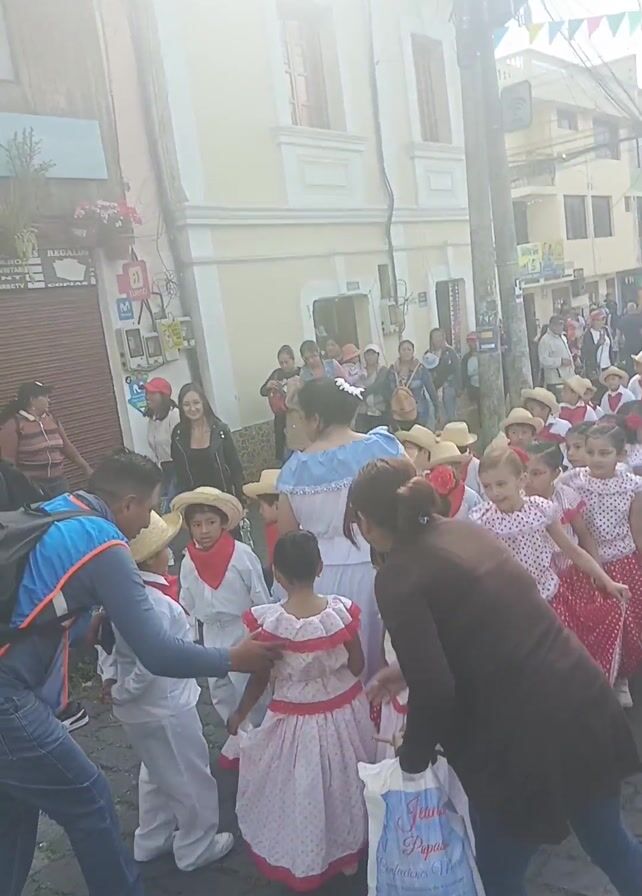 A group of children, dressed in traditional clothing, dances in a parade. The girls wear white blouses with red polka dots and red skirts with white polka dots, straw hats, and red flowers in their hair. The boys wear white pants and shirts with red scarves and straw hats. An adult woman in a light blue dress leads the group. Spectators watch from the sidewalks lined with buildings. Colorful banners hang overhead. The street is paved with cobblestones. One woman in jeans and a brown coat directs the children. A paper bag with the words “Juanito Popote” is visible in her hands. Music plays in the background.