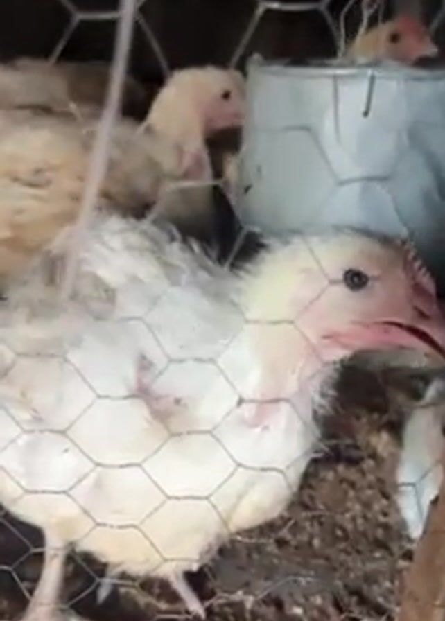 several young turkeys in a wire cage. The turkeys are mostly white, with some showing brown or tan patches. They appear to be huddled together in the enclosure, which contains bedding material on the floor and a metal container. The cage itself is made of wire mesh.