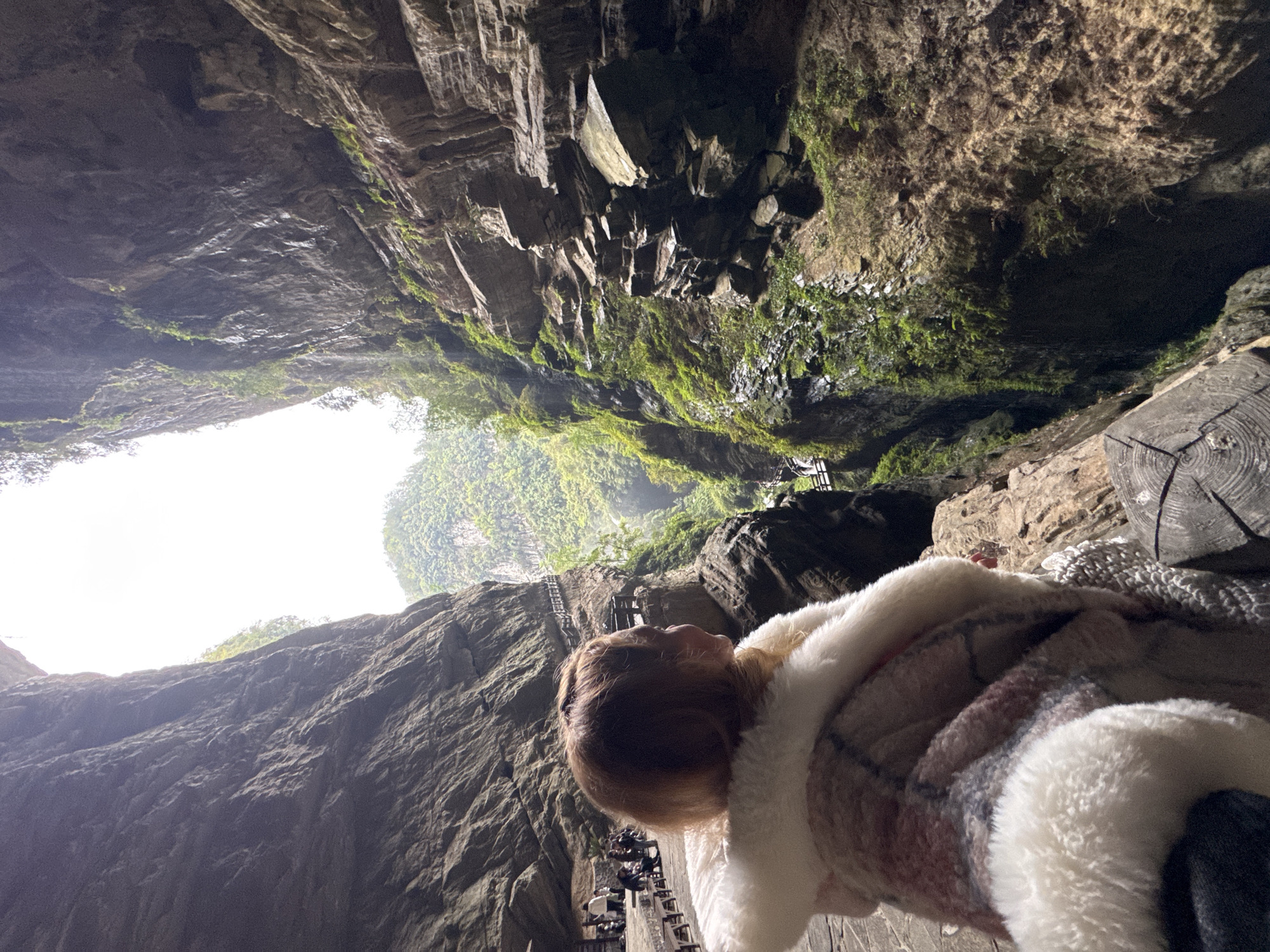 The image depicts a view from within a deep natural sinkhole in Wulong District, Chongqing, China. A person is lying down, looking up at the opening in the cave ceiling. The surrounding rock walls are rugged, with sections covered in green moss. A wooden walkway with people on it is visible near the base of one of the walls, hinting at the presence of a tourist attraction or path. The opening at the top lets in bright sunlight, revealing trees and vegetation.