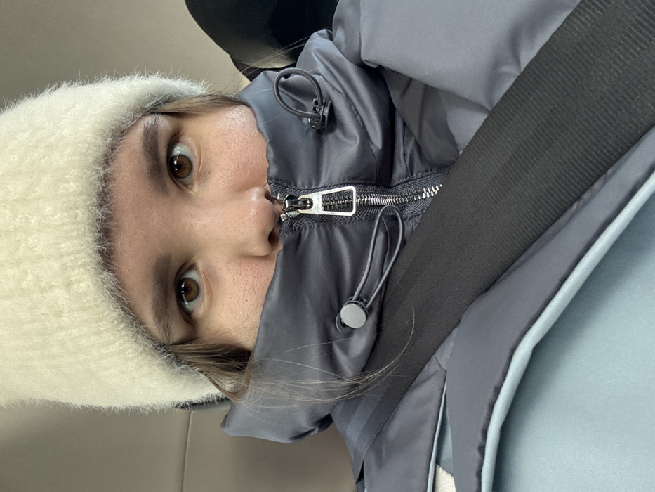 A female subject is depicted in the interior of a vehicle, in the city of Kazan, Russia. She wears a cream-colored knitted beanie and a dark grey puffer jacket with a high, fully zipped collar that obscures her nose and mouth, revealing only her brown eyes, eyebrows, and forehead. Strands of dark hair are visible below the beanie. A silver metallic zipper pull is centered on the jacket's collar, and two black drawstrings with grey stoppers are visible on the collar. A black seatbelt crosses diagonally from the upper left to the lower right of the frame, over the jacket and a visible light blue garment underneath. The background is a blurred, light grey interior, consistent with a vehicle's cabin. The subject is looking directly at the camera.