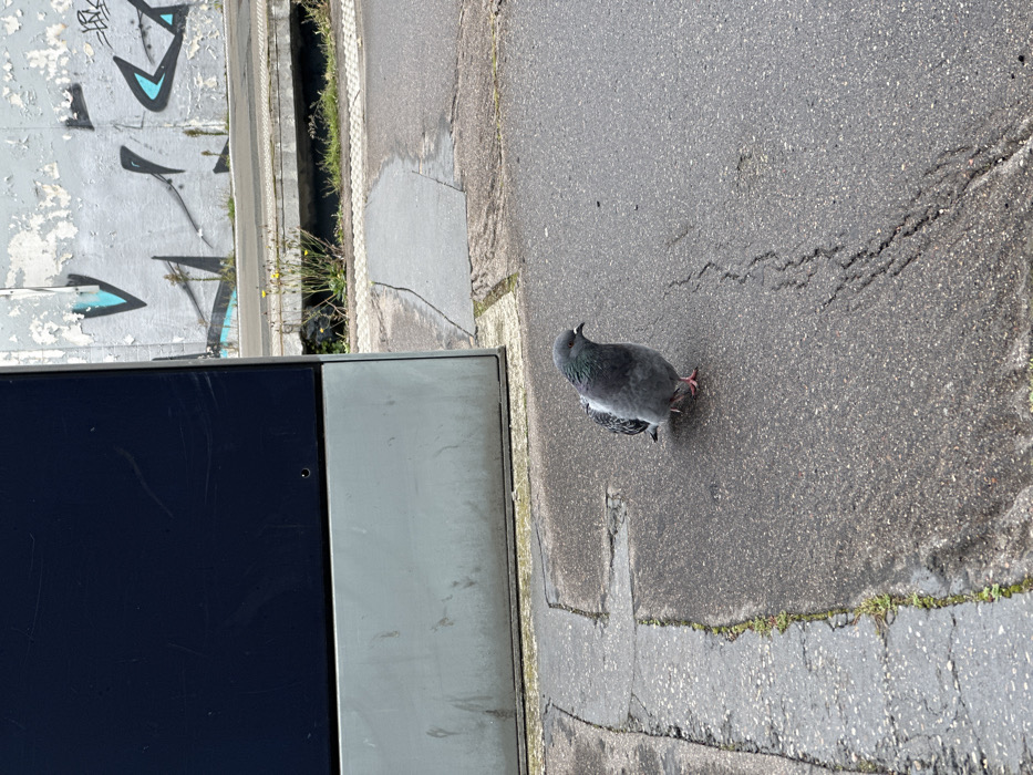 - "The scene, located in Bois-Colombes, France, depicts a single rock pigeon (Columba livia) standing center-right on a damp, dark gray asphalt surface" by FM-noBUi2, licensed under CC BY 4.0