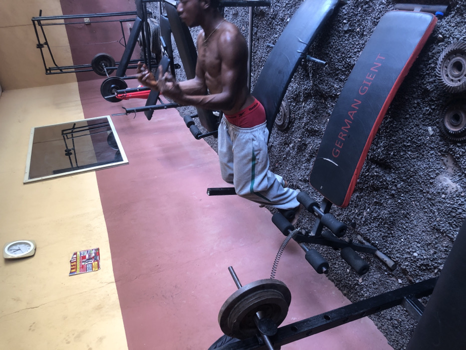 A shirtless man in red underwear and gray sweatpants works out on a leg extension machine. Other gym equipment surrounds him, including a weight rack, barbell, and a black and red bench. The floor transitions from red to gray gravel near the bench. A wall is split horizontally, painted beige above and red below. A mirror, clock, and a small graphic are attached to the wall.