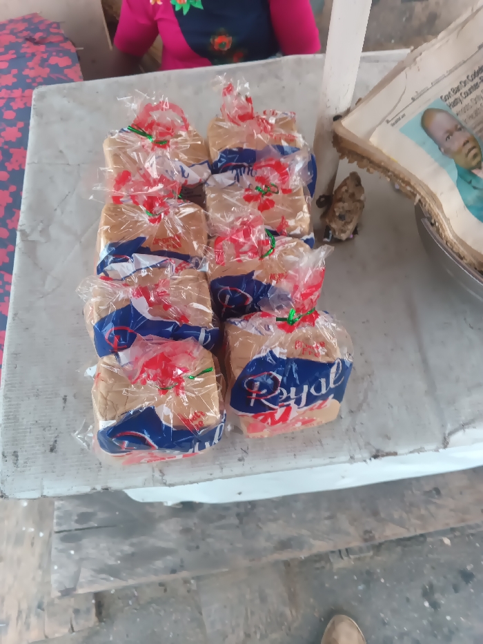 Packaged loaves of bread, labeled "Royal," are arranged on a white, worn table. Each loaf is wrapped in clear plastic and tied with red and green string. Behind the bread, a person wearing a pink top with a navy blue and black floral pattern is partially visible. An old newspaper featuring a person's face is displayed next to a small rock. A single shoe is subtly visible at the bottom of the frame. The overall scene suggests a market setting.
