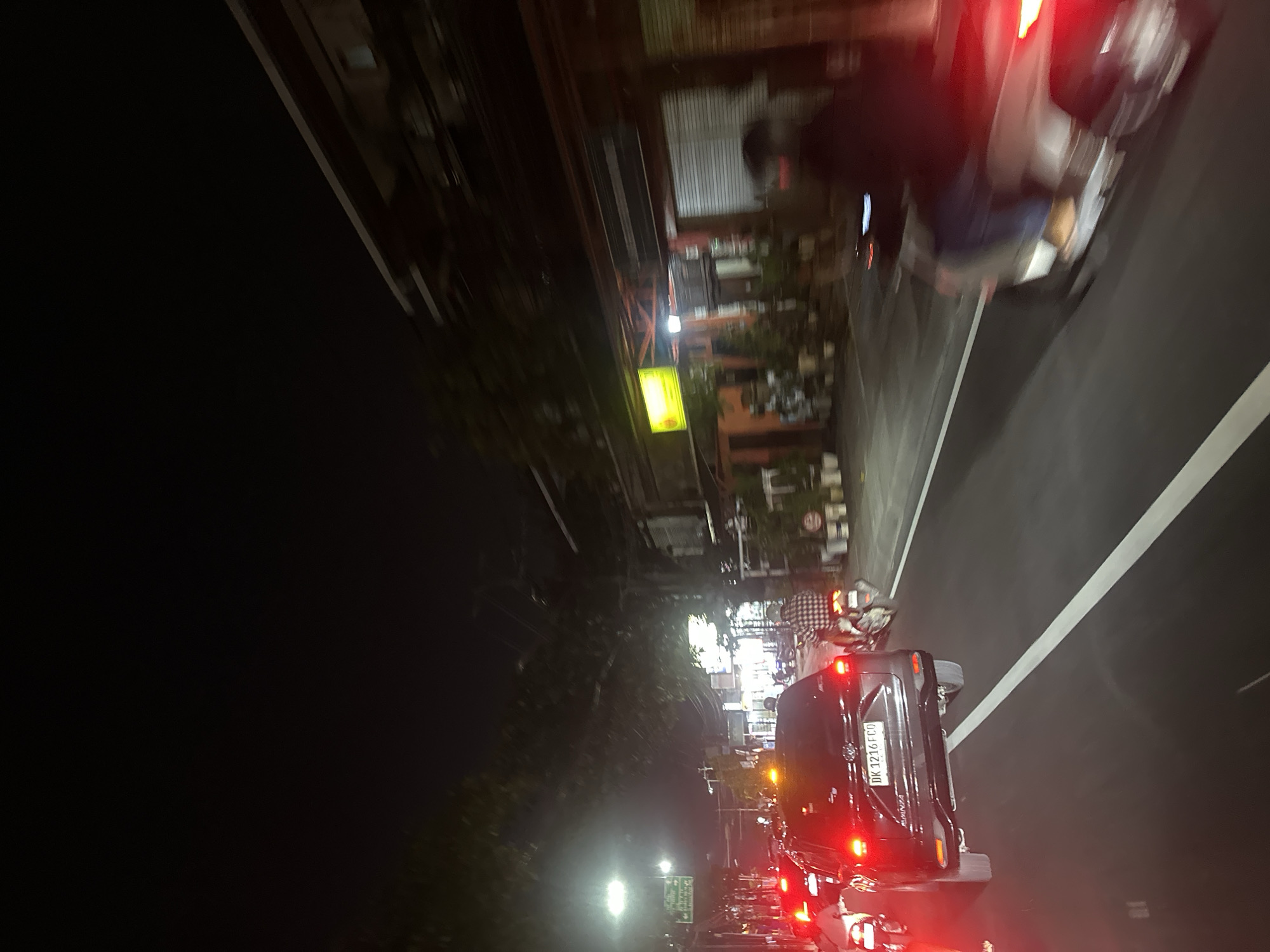 The image captures a nighttime street scene in Kerobokan Kelod, Indonesia, from a moving vehicle's perspective. The asphalt road features a prominent solid white lane divider extending from the bottom center diagonally to the middle right. Overhead, a dark sky is visible, with streetlights casting bright illumination on the left and various light sources emanating from roadside establishments on the right. In the immediate foreground-center, a dark-colored SUV, identifiable by "AVANZA" on its tailgate, is stationary or moving slowly, displaying illuminated red taillights and an amber warning light on its roof. Its Indonesian license plate reads "DK 1216 FCO." To the left of the SUV, a motorcycle's red taillight is partially visible. To the right of the SUV, a person wearing a plaid shirt is observed riding a motorcycle. Further right, a blurred person on a light-colored scooter, wearing a dark jacket and helmet, is moving forward, with the scooter's red taillight visible. The right side of the street is lined with multiple buildings. One building features an orange facade and a yellow sign. Another building displays a rolled-down metal shutter. Potted plants are arranged along the sidewalk in front of some buildings. In the distance on the left, additional vehicles with illuminated red taillights suggest traffic congestion, and a streetlight provides bright overhead illumination. Trees line parts of the street, appearing dark against the night sky.
