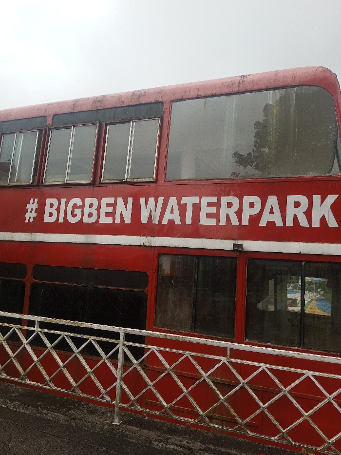 A weathered, two-story red structure resembling a double-decker bus is depicted in Nuwara Eliya, Sri Lanka, on an overcast day. The side of the structure prominently displays "# BIGBEN WATERPARK" in white capital letters between the upper and lower window rows. The red paint is faded and streaked with dirt and grime, particularly above the upper windows. The upper deck features multiple rectangular windows and a large curved front window section, reflecting an overcast sky and dark tree foliage. The lower deck windows are darker, with reflections on the right side showing elements of a light-colored structure and a blue surface, indicative of a waterpark environment. A white metal railing, featuring a diamond lattice pattern, runs horizontally along the base of the structure, above a dark, damp-appearing ground surface. No individuals are visible.