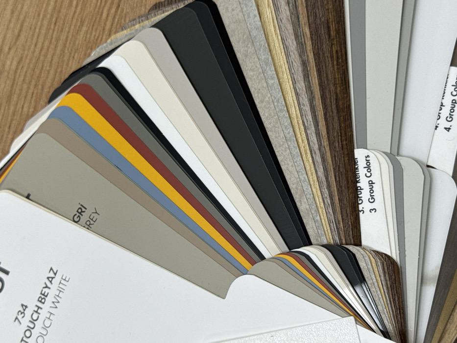 A fanned-out material swatch catalog is depicted on a light brown wooden surface. The catalog features multiple rectangular swatches displaying solid colors including white, light grey, dark grey, blue, yellow, dark red, black, and beige, alongside various wood grain and textured patterns. Text visible on the swatches includes "734", "TOUCH BEYAZ", "TOUCH WHITE", "GRİ", "GREY", "3. Grup Renkler", and "3 Group Colors", indicating bilingual product information in Turkish and English. No individuals or specific actions are discernible. This scene, located within the city of Yerevan, Armenia, is consistent with a commercial establishment specializing in interior design or construction materials, such as a showroom or design studio.