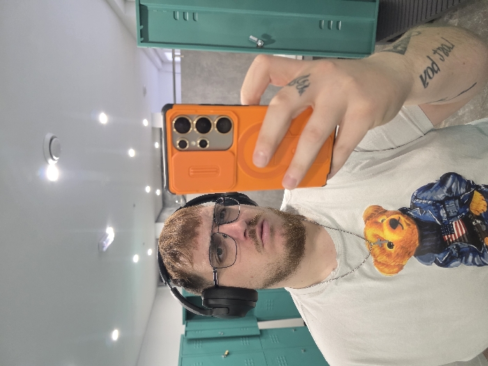 The scene depicts a male individual taking a selfie with a smartphone in an indoor locker room or changing facility located in Beloslav, Bulgaria. The subject, a male with light brown, short hair, glasses with black frames, and a stubble beard, is positioned centrally in the frame, facing the camera. He wears black over-ear headphones and a light-colored t-shirt featuring a graphic of a bear in a denim jacket and dark blue sweater with an American flag motif. A silver chain necklace is visible around his neck. His left hand, with a partial tattoo on the ring finger and a tattoo displaying mirrored text on the forearm, holds an orange-cased smartphone. The phone case has a prominent orange camera module protector displaying at least three large camera lenses and one smaller lens, along with a rectangular cutout and a circular magnetic attachment point on its back. The background features a row of teal-colored metal lockers with silver handles to the left, and a partially visible section of similar lockers to the right. The ceiling is white with multiple recessed circular lights and one rectangular fluorescent light fixture. A grey partition or wall is visible behind the subject's right shoulder, and a dark, possibly ribbed surface appears in the lower right background.