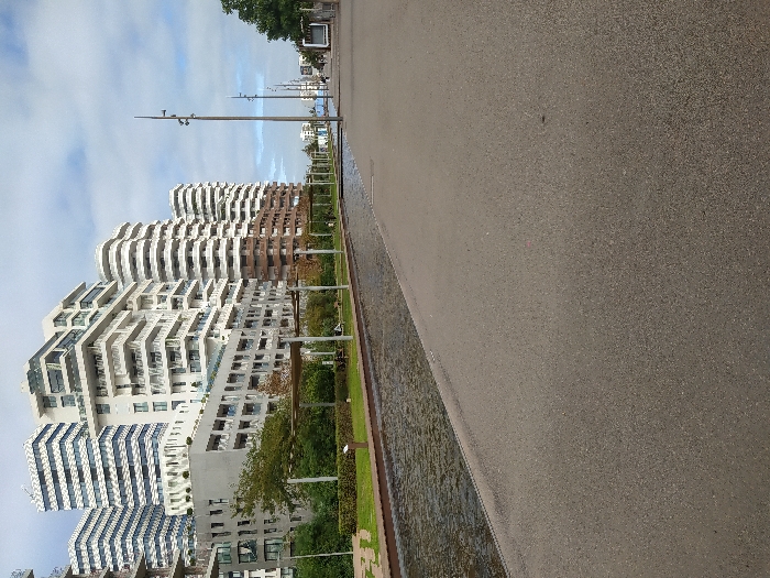 The image depicts a modern urban landscape in Casablanca, Morocco, characterized by contemporary architecture and planned green spaces under a partly cloudy sky. In the foreground, a wide, grey-brown asphalt pedestrian pathway occupies the right side of the frame, running parallel to a narrow, dark artificial water channel on the left. Beyond the water channel, a strip of manicured green lawn is visible, interspersed with low shrubs and small trees. Several light-colored overhead structures with fabric canopies provide shade over sections of this green area. Faintly visible within this landscaped zone are a few indistinct human figures, seated on benches. Behind this green strip are multi-story residential buildings, primarily light grey with numerous balconies. The background is dominated by a cluster of tall, modern high-rise buildings. These structures exhibit diverse contemporary architectural styles, including several white buildings with distinctive curved or wavy balconies, and others featuring a combination of white and darker paneling with a more rectilinear arrangement of windows and balconies. Further back, taller, glass-fronted buildings are also visible. To the far right, the paved pathway continues, lined with tall, slender streetlights featuring multiple luminaires. A light-colored structure, possibly a tram or bus stop, is discernible further down the path. No specific actions or interactions are clearly discernible among the distant individuals.
