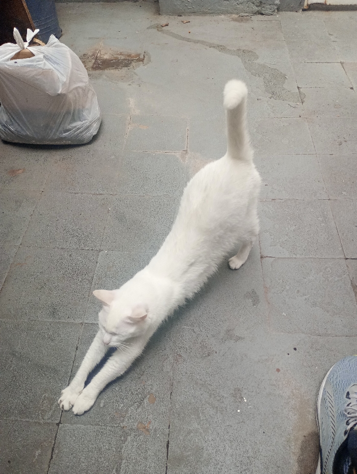- "A white cat stretches its body, paws extended, on a grey-tiled outdoor surface" by FM-kzA8r2, licensed under CC BY 4.0
