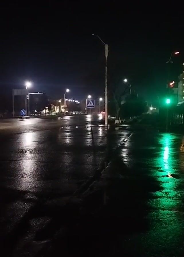 nighttime street scene, likely after rain, as the asphalt reflects the streetlights and a green traffic signal