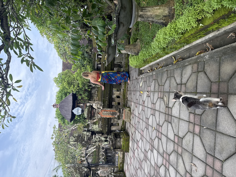 The image depicts an outdoor area within a Balinese temple complex in Batuan, Indonesia, under a partly cloudy sky. An adult female, facing away from the camera, stands in the midground, leaning on a moss-covered stone balustrade with her hands. She has light-colored hair and wears a strapless red top and a blue sarong with a colorful geometric pattern, secured by a yellow sash. Pink flip-flops are visible on her feet. Behind the woman, a traditional Balinese pavilion with a dark thatched roof and a central lantern fixture is visible, flanked by lush green trees and foliage. Intricately carved stone structures and walls, characteristic of Balinese architecture, extend across the background, including a stone gate with metal bars on the far left. In the foreground, a domestic cat, primarily white with grey and black patches, walks away from the viewer towards the lower right corner. Its tail is slightly elevated. The ground is paved with interlocking grey and red hexagonal stones, scattered with dried brown and yellow leaves. To the right, a narrow, moss-lined drainage channel runs parallel to a bed of vibrant green ground cover, where two grey lotus-shaped stone planters on pedestals are situated.