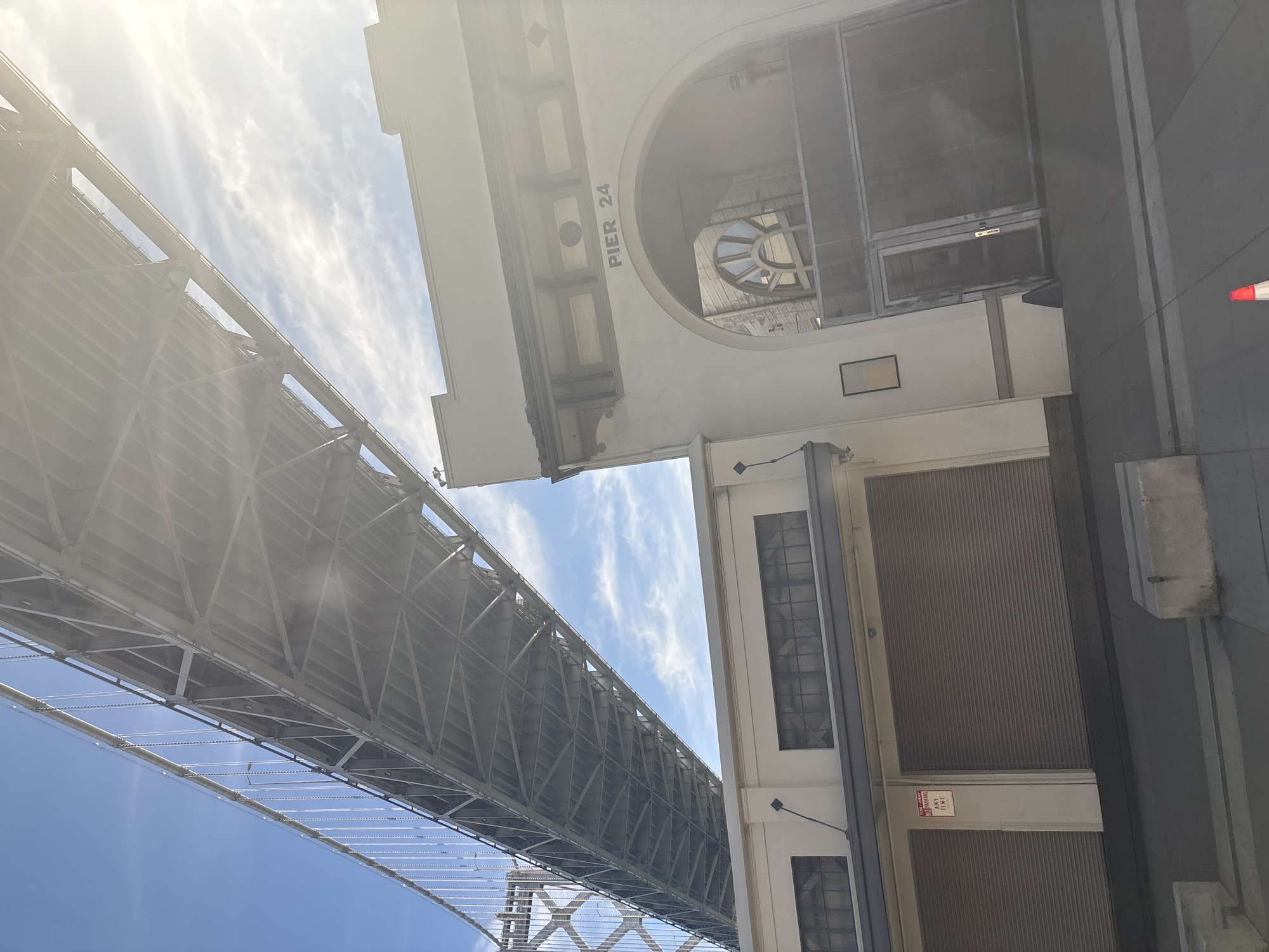 The image depicts an exterior view of Pier 24, located in San Francisco, California, United States of America, specifically situated underneath the San Francisco-Oakland Bay Bridge. The scene is illuminated by strong sunlight from the upper right, casting some lens flare. The primary structure is a two-story, light-colored building, presumably stucco or painted concrete, with "PIER 24" inscribed above a large arched entryway on its upper facade. The arch frames a recessed area with a glass-paneled door and a semi-circular window above. To the left of this main entrance, the building features two ground-level bays, each secured by a corrugated metal roller shutter. A white sign with red text, partially obscured by shadow, is affixed between these bays, reading "TOW-AWAY NO PARKING ANY TIME". The upper portion of the building displays decorative rectangular windows with dark frames and some dark, decorative elements below the roofline. Dominating the upper half and left side of the frame is the steel structure and suspension cables of the San Francisco-Oakland Bay Bridge. The bridge's grey underside, characterized by a lattice of beams and girders, angles upwards from right to left, with numerous vertical suspension cables visible against a clear blue sky with sparse white clouds. The ground in front of the building is a paved concrete sidewalk, with a dark street or ground surface in the foreground. A white and orange traffic cone is visible on the sidewalk in the lower right corner, and a few concrete blocks are also present on the ground level. No individuals or active vehicles are visible.