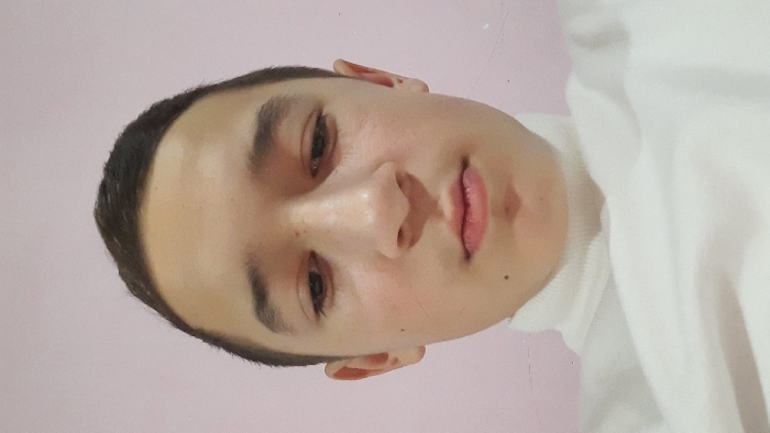 A person's face is centered in the image, slightly tilted. The individual has short, dark hair and light skin. They are wearing a white turtleneck sweater. The background is a plain, light pink or peach color. The person's eyes are open, and their expression appears neutral. A small mole is visible on their cheek.