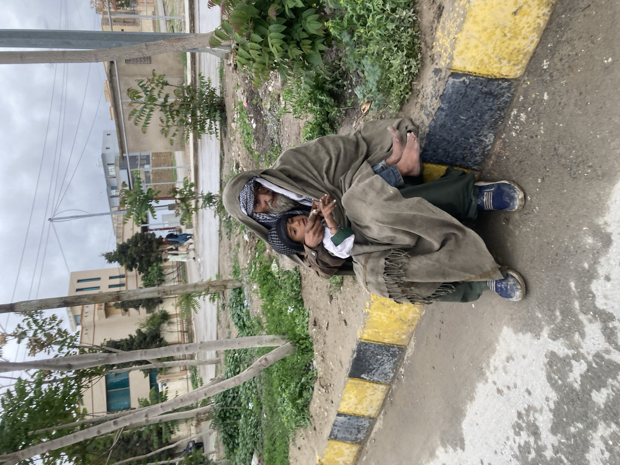 In Quetta City Tehsil, Pakistan, an older man with a headscarf and long, gray beard is seated on the ground near a curb marked with alternating yellow and black stripes. He is wearing a shawl-like garment and has bare feet. A young child, also wearing a headscarf, is held by the man. The child wears a white shirt with a green accent. The ground is dirty, with sparse grass and weeds. Buildings and trees are visible in the background, suggesting an urban setting. The sky is overcast.