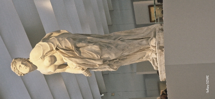 A full-length, off-white marble statue of a classical female figure stands prominently in an indoor museum setting