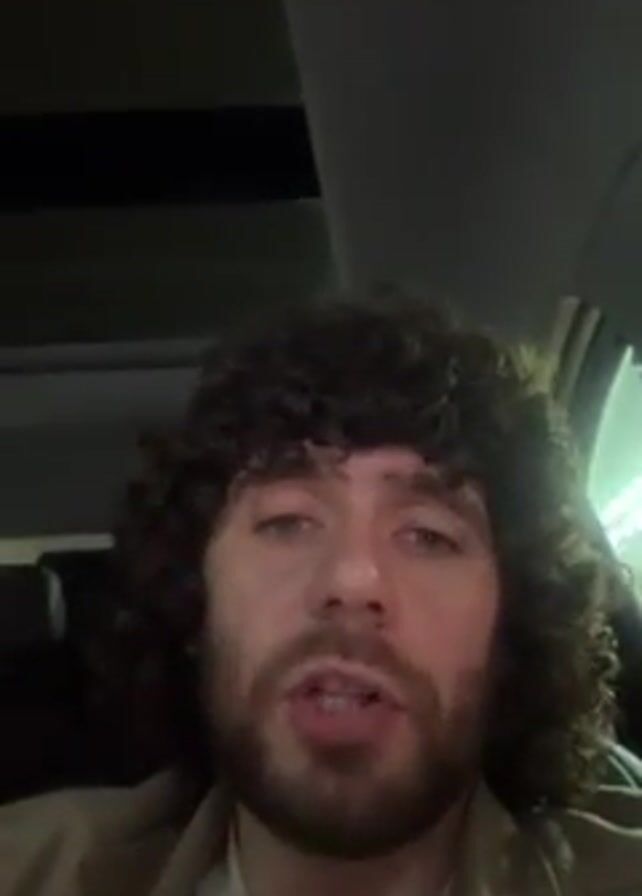 A man with curly hair and a beard sits in a car and looks into the camera. He is holding a white cup with an orange stripe and a straw. The interior of the car is visible, including the ceiling and part of the window.