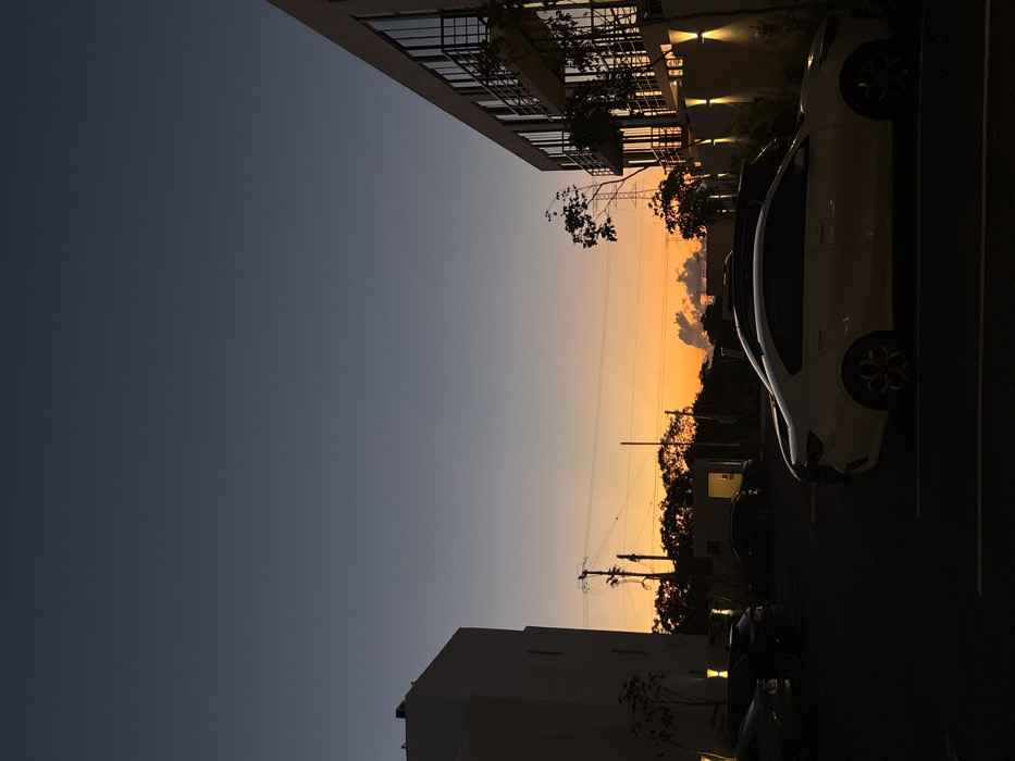 The image captures an outdoor scene at dusk or sunset in Chablekal, Mexico. The sky dominates the upper two-thirds, exhibiting a gradient from dark blue at the zenith to a vivid orange and yellow along the horizon, with several distinct clouds silhouetted against the bright portion. In the foreground and mid-ground, a paved parking area contains multiple parked vehicles, most appearing as dark silhouettes. A light-colored sedan is prominently visible in the right foreground. To the left, a tall, light-colored building stands largely in shadow, displaying rectangular window cutouts. To the right, another multi-story, light-colored building features balconies with dark railings and large windows, its facade illuminated by several warm yellow wall-mounted lights. Silhouettes of numerous trees and dense foliage form a line across the horizon. Utility poles with overhead lines are visible in the mid-ground against the sunset glow, along with a faintly discernible electrical pylon further in the distance. No individuals, actions, or interactions are present in the scene.