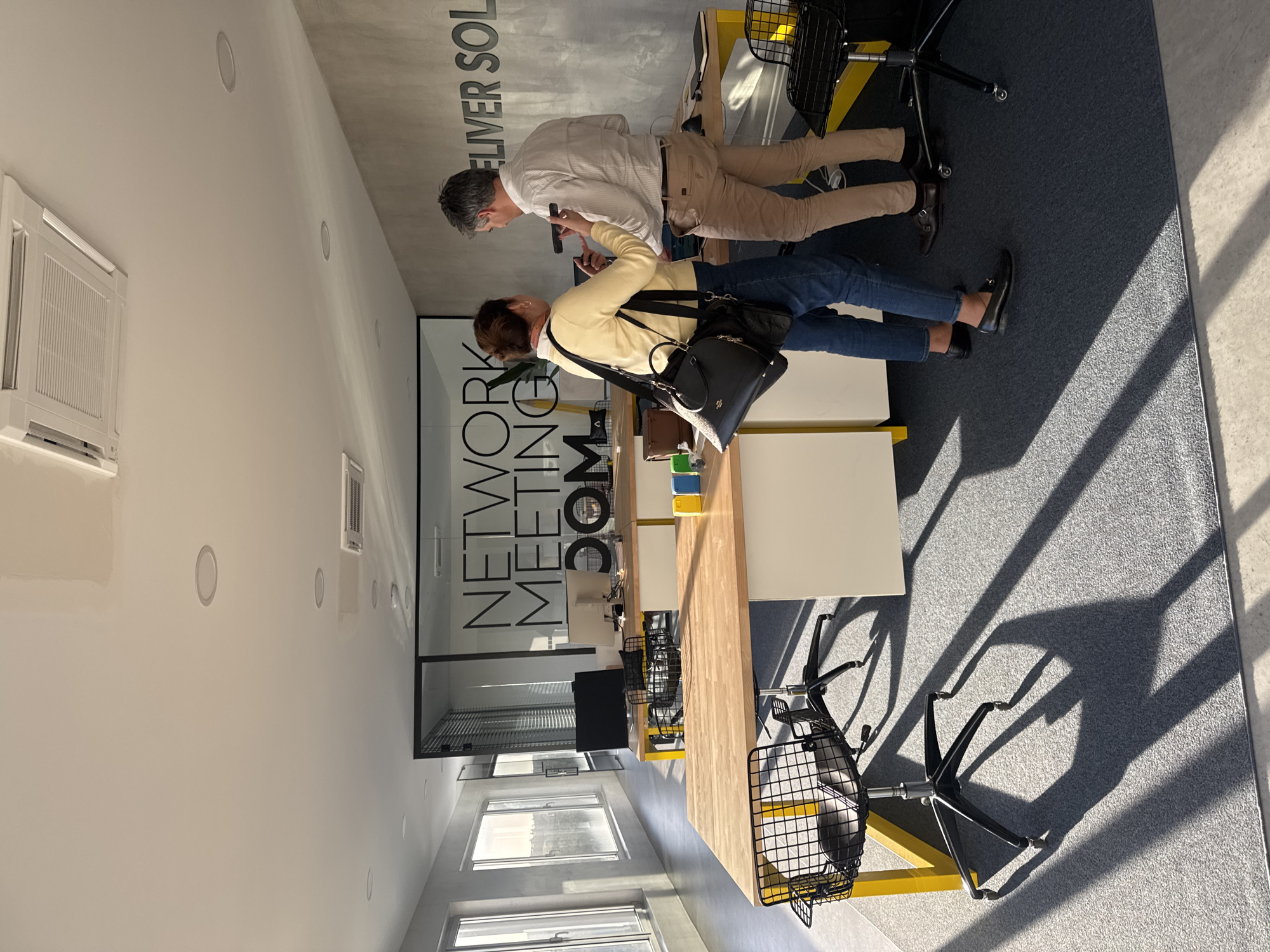 The image depicts a modern office interior located in Torres Vedras, Portugal. Two individuals are standing near a large, light-wood desk with a yellow and white base, positioned on a grey carpeted floor that shows distinct shadows from window frames. The female on the left wears a yellow long-sleeved top, blue jeans, and black loafers, carrying a black handbag with a shoulder strap and a smaller black bag. She holds a black smartphone in her hands, interacting with its screen. The male on the right wears a light-colored button-up shirt, tan trousers, and black monk-strap shoes. He holds a dark object, possibly a pen or small device, in his right hand. They are positioned facing each other, suggesting an interaction or discussion. To the left, a series of large windows provide ample natural light, illuminating a walkway with a grey concrete-like wall. Behind the primary desk, a glass partition features the black text "NETWORK MEETING" and "DOM". Beyond this, another desk with a black computer monitor is visible. The right wall, also with a concrete-like finish, displays raised grey lettering spelling "DELIVER SOLU" (partially visible). The ceiling is white with multiple recessed circular lights and two visible square air conditioning units. Several black wire mesh office chairs with castor wheels are positioned around the desks. On the main desk, three colored containers (yellow, blue, green) are present.