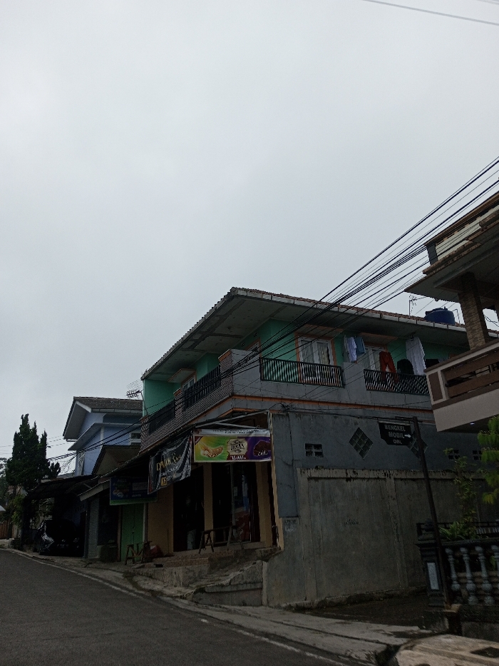 This scene is located in the city of Ambakirano, Madagascar. The image captures an urban street under an overcast, light grey sky. An asphalt road occupies the lower-left foreground, gently inclining upwards towards the left, bordered by a concrete sidewalk on the right. A two-story building dominates the right side of the frame. Its upper floor features a light teal facade with a black metal balcony railing. Several items of clothing, including light-colored shirts, a pair of red pants, and dark shirts, are hung on lines over the balcony for drying. Two sets of double doors or large windows open onto this balcony. The ground floor of this building is constructed of grey concrete. Two commercial banners are attached to the ground floor; one is a dark, partially obscured banner, and the other is a lighter banner depicting food (possibly a pastry) with text that includes "Jualan." Below these banners, an entrance to a shop is visible, with two light-colored stools placed on the steps. To the right of the shop entrance, a large, vertical, lighter grey panel, possibly a garage door, is present. A signpost next to this panel displays the text "BENGKEL MOBIL" and "OBL." Numerous dark utility cables traverse the upper middle section of the image, running horizontally in front of and above the central building. A blue plastic water tank is visible on the roof of an adjacent building to the far right. To the left, another multi-story structure is partially visible behind the central building and a utility pole. This building has a light blue upper facade and a dark-tiled roof. Further down the street on the left, additional structures are interspersed with dense green foliage, including a tall, dark green coniferous tree. No people, vehicles, or animals are visible within the frame.