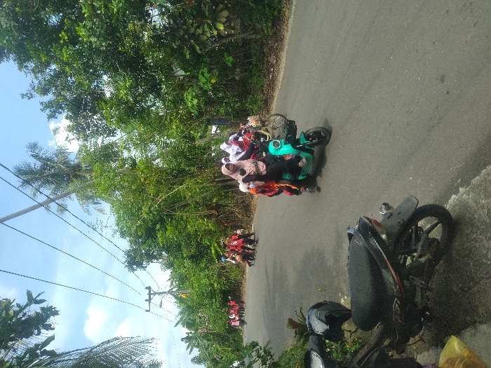 This image captures a daytime scene on an asphalt road in Keude Cunda, Indonesia, bordered by dense green vegetation under a clear to partly cloudy sky