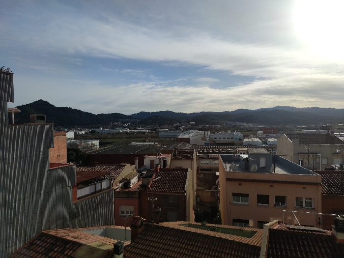 A cityscape unfolds under a partly cloudy sky with a bright sun. The foreground features densely packed buildings with terracotta-tiled roofs. Beyond them, a flat industrial area stretches towards dark, tree-covered hills on the horizon. The architecture is a mix of residential and commercial structures, suggesting an urban environment blending into a natural landscape. A building with corrugated metal panels is prominently seen to the left.
