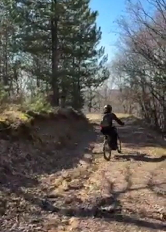 - "A person wearing a helmet and backpack rides an electric bicycle down a dirt path in the woods on a clear day" by FM-7QNAW2, licensed under CC BY 4.0