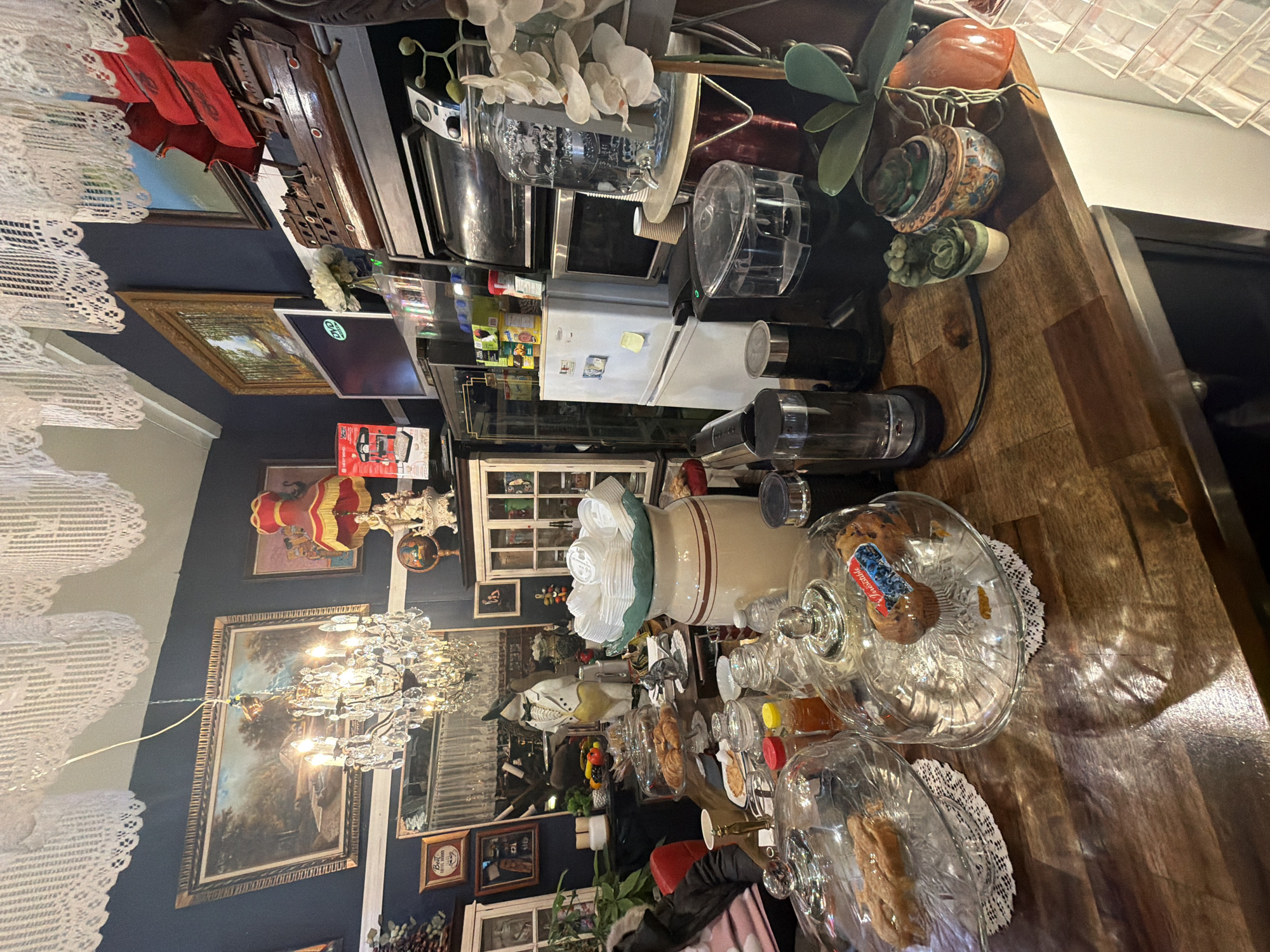 This image appears to be an interior shot, likely taken in a home or a store decorated in an ornate, maximalist style. The foreground is dominated by a wooden countertop cluttered with kitchen appliances (blender, toaster oven, microwave), dishware, and decorative objects, including glass cake stands and decorative plants. The background reveals a room with dark blue walls covered with framed pictures and a chandelier. The overall decor suggests a cluttered but potentially stylish space. There is not enough information to definitively confirm it's located in Montreal, Canada.