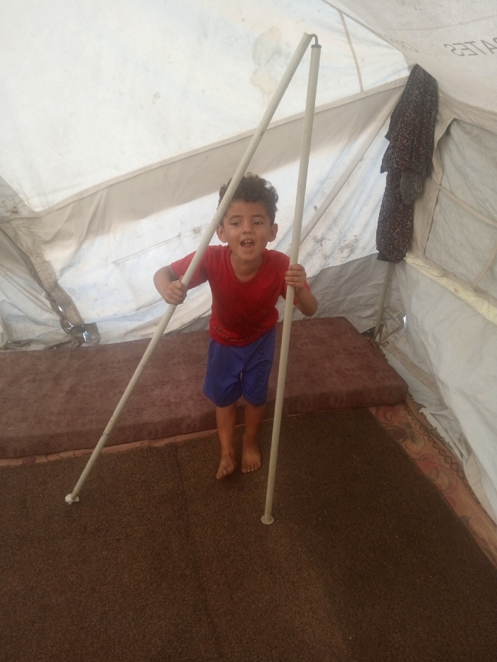 The image depicts a young child inside what appears to be a white canvas tent in Khan Yunis, Unknown