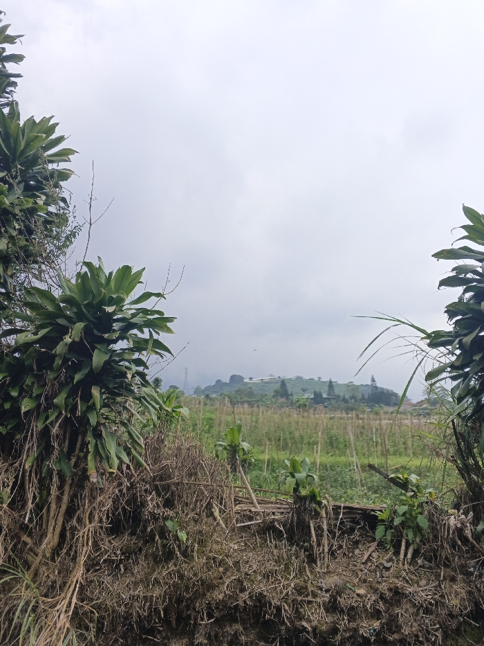 The image depicts an outdoor agricultural landscape in Siexiengmai, Laos, under a uniformly overcast sky. The immediate foreground features a dense mass of dry, matted brown vegetation and exposed soil, resembling an embankment or ditch. Lush green foliage with broad leaves frames the left and right sides of the view, with smaller green plants emerging from the dry material in the center. In the midground, an extensive field of cultivated green crops is visible, arranged in rows, with each plant supported by individual vertical stakes or poles. The background reveals a prominent hill or elevated terrain, topped with multiple white-roofed structures and scattered trees, including distinct conical evergreens. A tall, slender communication tower is partially visible to the far left in the background, obscured by atmospheric haze. A small, dark, indistinct object, likely a bird, is discernible against the cloudy sky above the background hill. No individuals, explicit actions, or direct interactions are present in the scene.