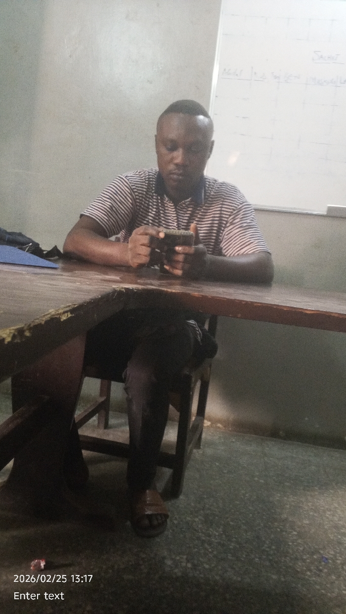 In Dakata, Nigeria, an indoor scene depicts an adult male seated at a wooden table, engaged with a smartphone. The male, with a short haircut, wears a striped short-sleeved polo shirt, dark trousers, and brown sandals. His hands hold a dark-colored smartphone, and his gaze is directed downwards towards the device. To his left on the table, a blue folder or bag is visible. The wooden table shows signs of wear, particularly along its front edge. The male occupies a wooden chair positioned behind the table. In the background, a light-colored wall with minor imperfections is visible, with a whiteboard to the right containing faint, illegible writing, including partial words like "Sachet" and "Modul." The floor is gray with a speckled pattern, and a small, crumpled red and white object lies on the floor in the lower left quadrant of the image. The lighting appears even but somewhat dim, casting subtle shadows. The image is timestamped 2026/02/25 13:17.