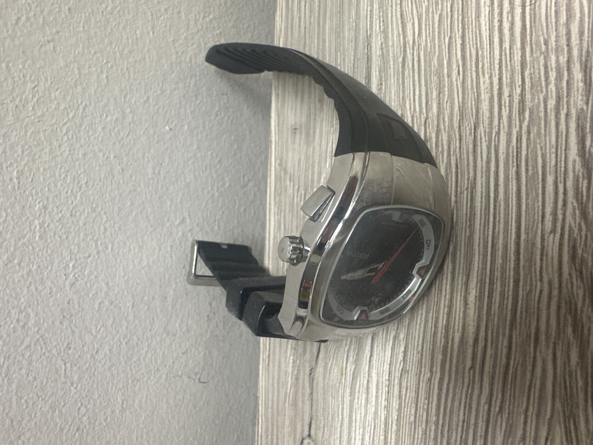 - "A silver wristwatch with a black rubber strap is displayed against a background with a distinct division: the left side shows a textured, light grey wall, and the right side features a surface with light and dark vertical wood-like grain patterns" by FM-PjZ023, licensed under CC BY 4.0