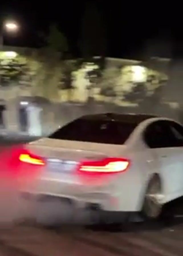 At night, a white BMW sedan with dark roof does a donut in the middle of a street intersection, emitting a cloud of white smoke. There are pedestrians gathered around the intersection, some holding phones to record the car’s stunt. Street lights and building lights illuminate the scene.