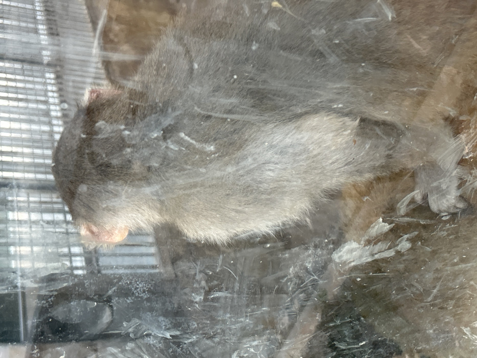The scene, located in Barza Municipality, Syria, depicts a single primate subject, likely a monkey, contained within an enclosure. The animal is observed from a slightly elevated rear-right perspective, facing towards the left side of the frame. Its fur displays a dark brown to grey coloration on the dorsal and upper lateral surfaces, transitioning to a lighter grey-tan on the lower flank. The right ear is partially visible, exhibiting a pinkish hue. The primate's right forelimb and digits are discernible in the lower right portion of the image, resting on an earth-toned substrate. The viewing plane is obscured by a transparent barrier, possibly glass or acrylic, which is heavily contaminated with smudges, streaks, and particulate matter, including dried white residue. In the background, beyond the primate and the barrier, a metal mesh or barred structure, consistent with an animal enclosure, is visible, along with an indistinct dark object on the left, possibly a structural or enrichment element of the habitat. No human subjects or direct interactions are depicted.