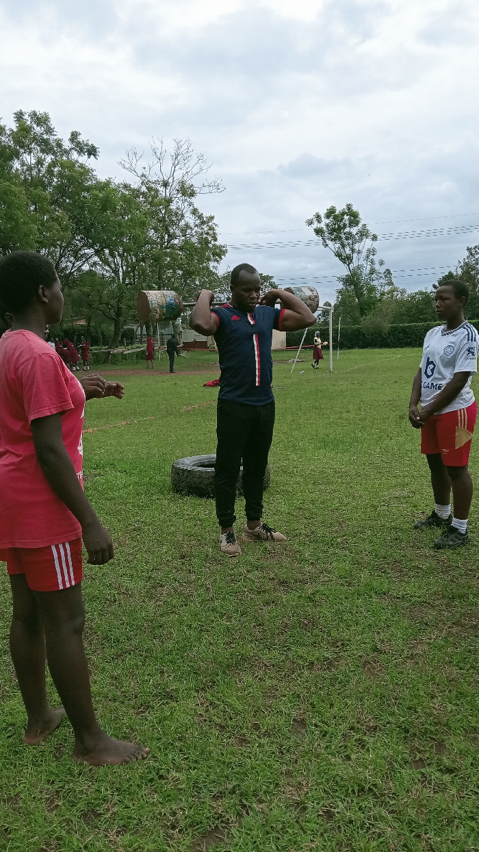 The image captures an outdoor training session on a green grassy field in Lumakanda ward, Kenya, under an overcast sky