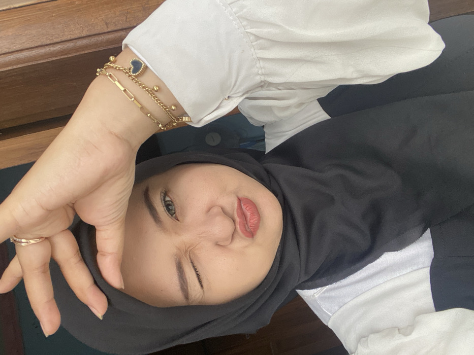 A female individual is depicted in a close-up, chest-up portrait. She is wearing a black hijab and a white long-sleeved top with gathered cuffs, layered over a visible black garment. Her left eye is closed in a wink, and her lips are puckered. She exhibits light-colored irises, visible eyeliner, and defined eyebrows. A gold-toned ring is present on her left ring finger. Her right wrist displays two gold-toned bracelets: one with a paperclip chain design and another with spherical charms and a black heart-shaped pendant. Her left hand is raised, with fingers bent. The scene is an unspecified indoor location within Gelam, Indonesia. The background consists of a vertical light-brown wooden surface to the right of the subject and a darker, indistinct area to her left, where a faint white circular object is partially visible.