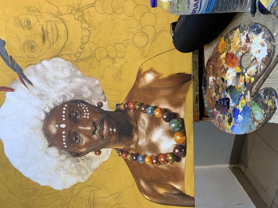 An indoor scene in Ado, Nigeria, displays an artist's workspace. A large, unfinished oil painting on canvas is positioned centrally, depicting a realistic portrait of a dark-skinned individual with voluminous white hair, white facial markings (dots on the forehead, cheeks, and chin), red circular earrings, and a prominent necklace composed of large, multi-colored spherical beads. The painting's background is a golden-yellow, featuring a partially sketched outline of a second individual to the right, and two feathers (red and blue/black) near the top right of the main figure's head. In the lower foreground, a wooden artist's palette, heavily stained with various paint colors and featuring a resting paintbrush, is visible on a surface. To the right of the palette, a black portable Bluetooth speaker and a clear plastic bottle of "NIRVANA Premium drinking water" are present. The immediate environment includes a light-colored tiled floor and a white wall with a dark baseboard in the lower left.