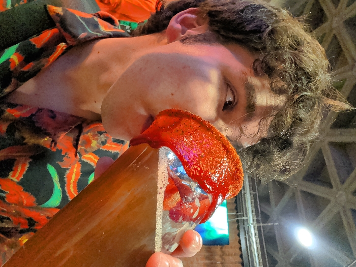 A young adult male with curly brown hair, wearing a dark patterned shirt featuring orange, red, and green motifs, is shown in a medium-close, upward-angled shot. He is actively drinking from a clear glass mug containing a dark amber liquid, consistent with beer, topped with a slight foam head. The rim of the glass is heavily garnished with a thick, vibrant red, textured coating, indicative of chamoy and chili-lime seasoning, which visibly drips down the side. The male's head is tilted back, eyes open and directed towards the upper right, away from the camera. His right thumb and fingers are visible, securing the glass. The background features an indoor environment characterized by a light-colored, structural latticework ceiling and a prominent, circular white light fixture in the upper right. A blurred, luminous blue-green rectangular object, possibly a display screen, is also visible, along with a blurred orange element on the left. This scene occurs within an indoor establishment, likely a bar or restaurant, in Mexico City, Mexico.