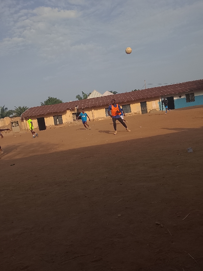 A group of individuals are engaged in a soccer game on a dusty field. Several players are running, while a soccer ball is suspended mid-air. A long, low building with a reddish-brown roof is situated in the background. The structure appears to be composed of multiple sections, with windows and doorways visible along its facade. The sky is partly cloudy.
