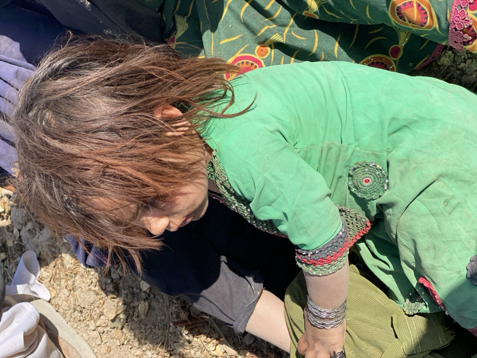 A young child is depicted seated outdoors in Mandisar, Afghanistan, under direct, harsh sunlight. The child, observed in left profile, has unkempt, reddish-brown hair. They wear a bright green, long-sleeved garment featuring multi-colored crocheted cuffs in shades of grey, red, and green, interspersed with white bead-like embellishments. A similar circular, red-centered decorative motif with white beads is visible on the garment's front. The child's right wrist is adorned with multiple thin, silver-toned bangles. To the child's immediate left, a person's leg encased in dark trousers and an arm with a light-colored, possibly white, sleeve are partially visible. To the child's right, a dark green textile patterned with orange and yellow circular and abstract designs is present. The immediate ground environment consists of dry, rocky, and dusty earth with scattered debris, and strong shadows are cast by the intense sunlight.