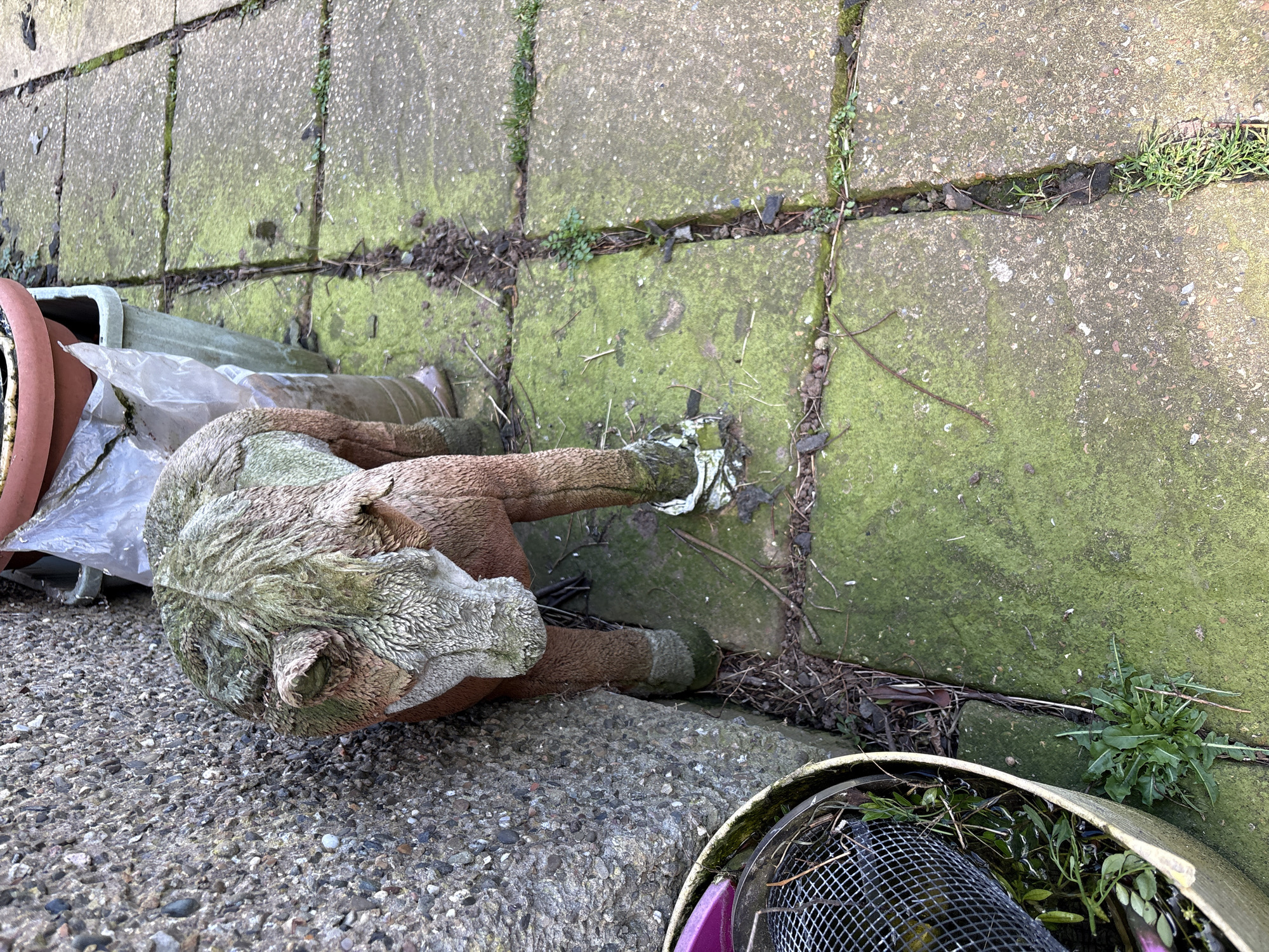 discarded, weathered, stuffed animal resembling a deer or horse lying on a paved surface. The paving is made of irregularly shaped concrete slabs and rectangular tiles, with green moss and vegetation growing in the joints between them. The stuffed animal is discolored and dirty, and it is positioned among other discarded items, including plant pots, plastic sheeting, and a debris-filled basket. The location is Pulverbatch, United Kingdom.