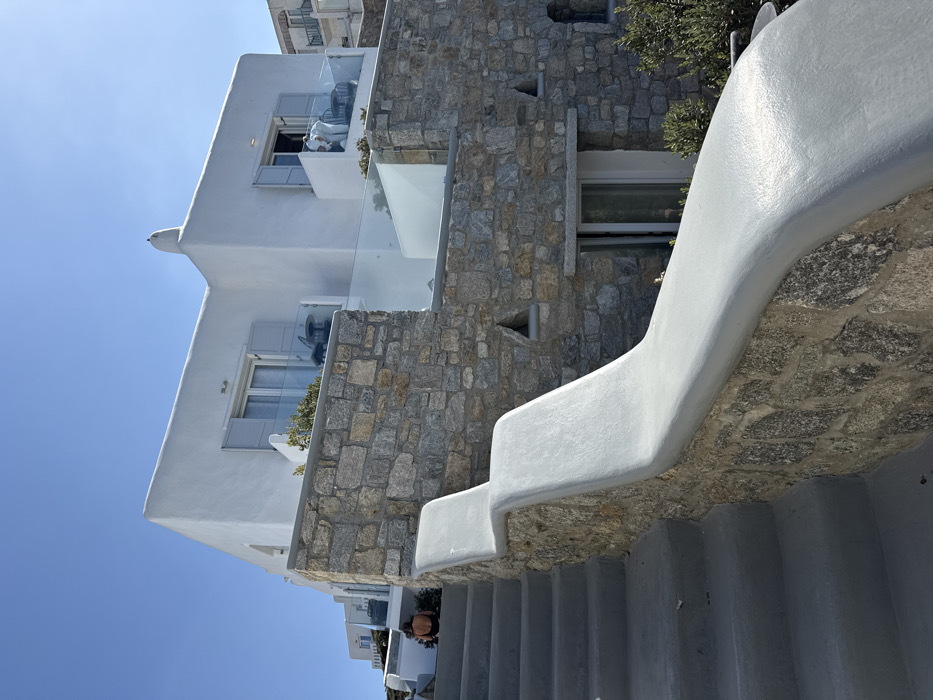 The image displays a multi-level architectural scene in Mykonos, Greece, under a clear blue sky. In the foreground, a light grey, smoothly rendered concrete or stucco handrail with an undulating top surface curves upwards from the lower left, positioned atop a rough-hewn stone masonry wall. Adjacent to this handrail, a set of grey concrete steps ascends. The midground features building structures. A substantial lower section is constructed from irregularly shaped, light-colored stone masonry, presenting multiple triangular openings and a ground-level rectangular window. Above this stone base are whitewashed stucco buildings with flat roofs. Two balconies are visible on the upper levels; both are equipped with clear glass railings, light blue-grey window shutters, and two dark chairs with a small table each. On the rightmost visible balcony, an individual clad in a light-colored, possibly white, top and light-colored trousers is partially visible, leaning forward towards the railing, with their back partially to the observer. Further to the lower left, on a visible landing beyond the main staircase, a dark-clad figure is seated or crouching. The scene is illuminated by direct sunlight, casting distinct shadows.