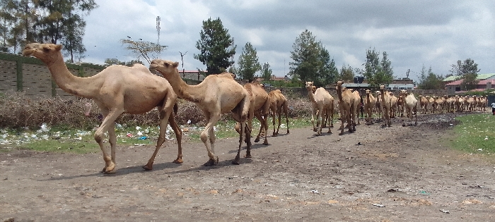 - "A long line of approximately thirty to forty dromedary camels, uniformly light tan, proceeds in single file along an unpaved dirt road in Athi River ward, Kenya" by FM-RR35N2, licensed under CC BY 4.0