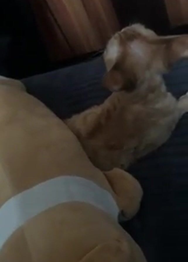 n orange cat laying on a gray striped bed with a large, light-brown stuffed animal next to it. A hand briefly comes into view at the bottom left of the screen. The cat is lying on its side with its back to the camera and its head turned away.