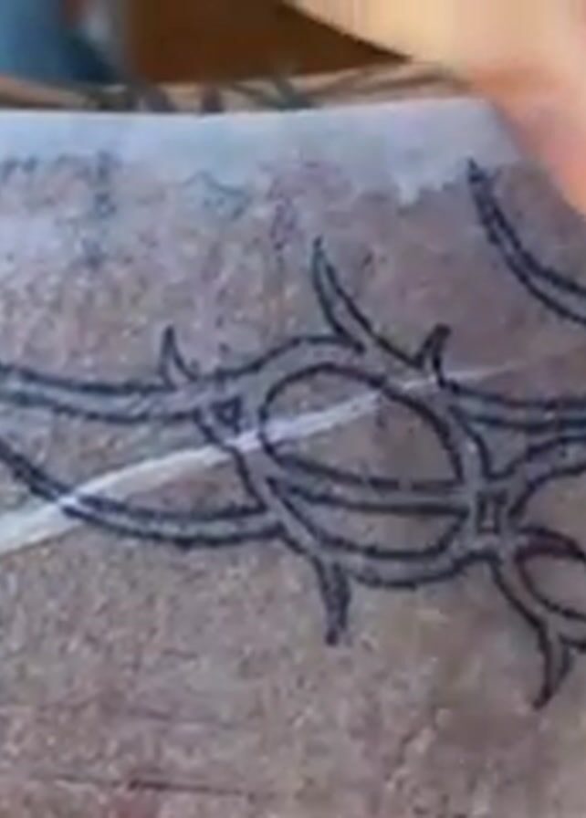 person transferring a tattoo design onto skin. A sheet with a stencil of a design resembling a barbed wire or thorny vine is carefully peeled away. The design is now visible in purple ink on the skin, ready to be traced by a tattoo artist. The skin already has other tattoos on it, above where this new one is being placed. The background is blurred, but appears to be indoors.