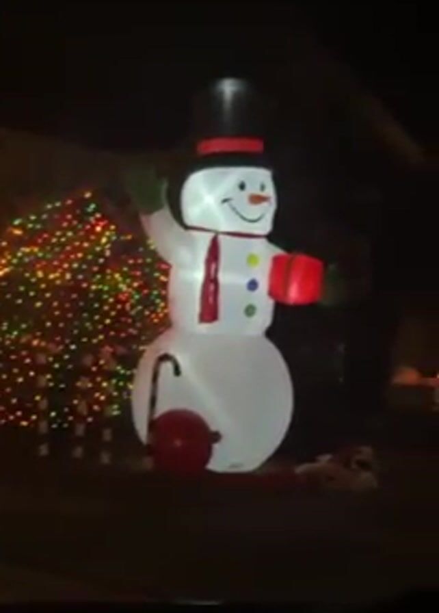 nighttime view of a lawn decorated for Christmas. An inflatable snowman is the primary focus, standing on a lawn in front of a dark house. The snowman is white with a black top hat adorned with a red band, a red scarf, colorful buttons (blue, green, yellow), and holding a red gift. One of its hands is raised in a wave. Next to the snowman is a large candy cane decoration and a fallen red ornament. The bushes behind the snowman are covered in colorful Christmas lights. There are more decorations farther to the left, partially obscured. The video is shot from inside a vehicle, suggesting the viewer is driving past the display.