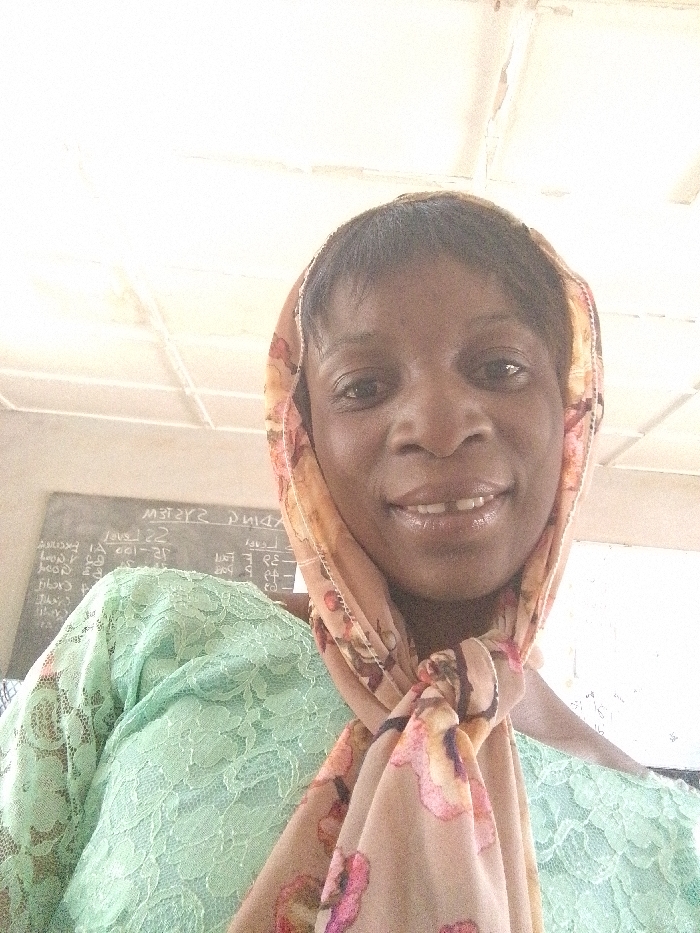 An adult female is depicted in a close-up, front-facing image, likely a selfie, smiling directly at the camera. She has dark skin and short dark hair, partially covered by a light beige headscarf with a pink and orange floral pattern, tied under her chin. She is wearing a light green, possibly lace-textured, long-sleeved garment. The background includes a dark chalkboard with white, mirrored chalk writing, part of which reads "SYSTEM" and "LEVEL 22". Above and behind her, a light-colored ceiling with visible panel lines is present. The scene is located in Barnawa, Nigeria, and appears to be indoors, possibly a classroom or office.