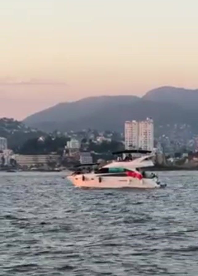 yacht on the water, with buildings and hills in the background. The yacht is white with a black roof and some red detailing. There appear to be people on the yacht. The water is choppy. The sky is a pale blue with hints of pink and orange, suggesting it might be dawn or dusk. The buildings on the shore appear to be a mix of residential and commercial structures, with some greenery visible on the hills.