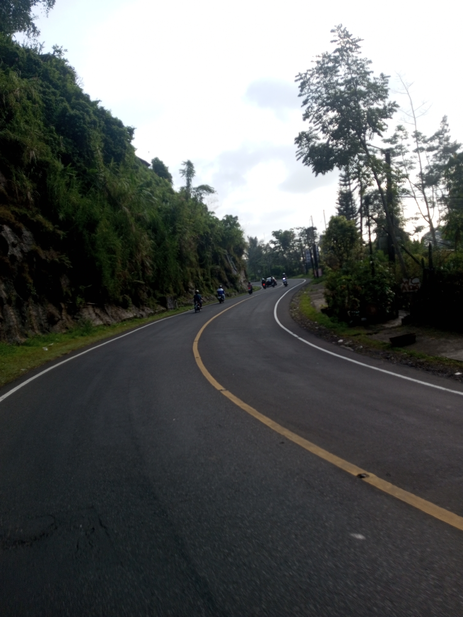 The image depicts a paved road curving through a lush, mountainous landscape near Mya Sit Kaing Ywar Thit, Myanmar. The road has a yellow centerline and a white edge line. A group of motorcyclists are traveling along the road, further ahead on the curve. The roadside is lined with dense green vegetation and trees, which rise up a steep hillside on one side, while the other side features more scattered trees and undergrowth. The sky is overcast.