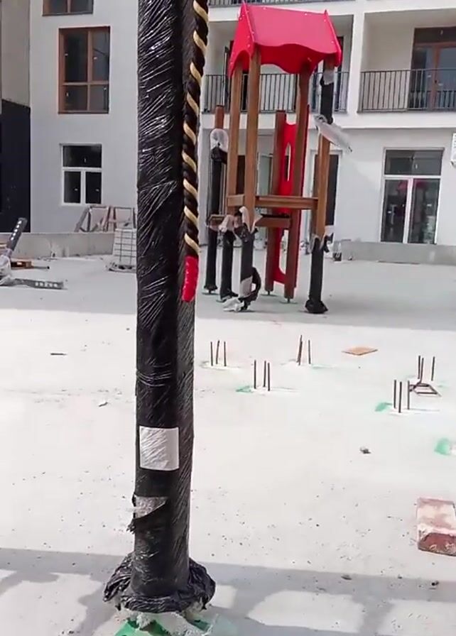 n outdoor construction site. A man in a blue jacket, black pants, and a black bucket hat is sitting on some wooden planks, holding a small hammer. In the background, there is a white building with balconies and a children's playset with a red roof. The ground is concrete with metal rods sticking out, and various construction materials scattered around.
