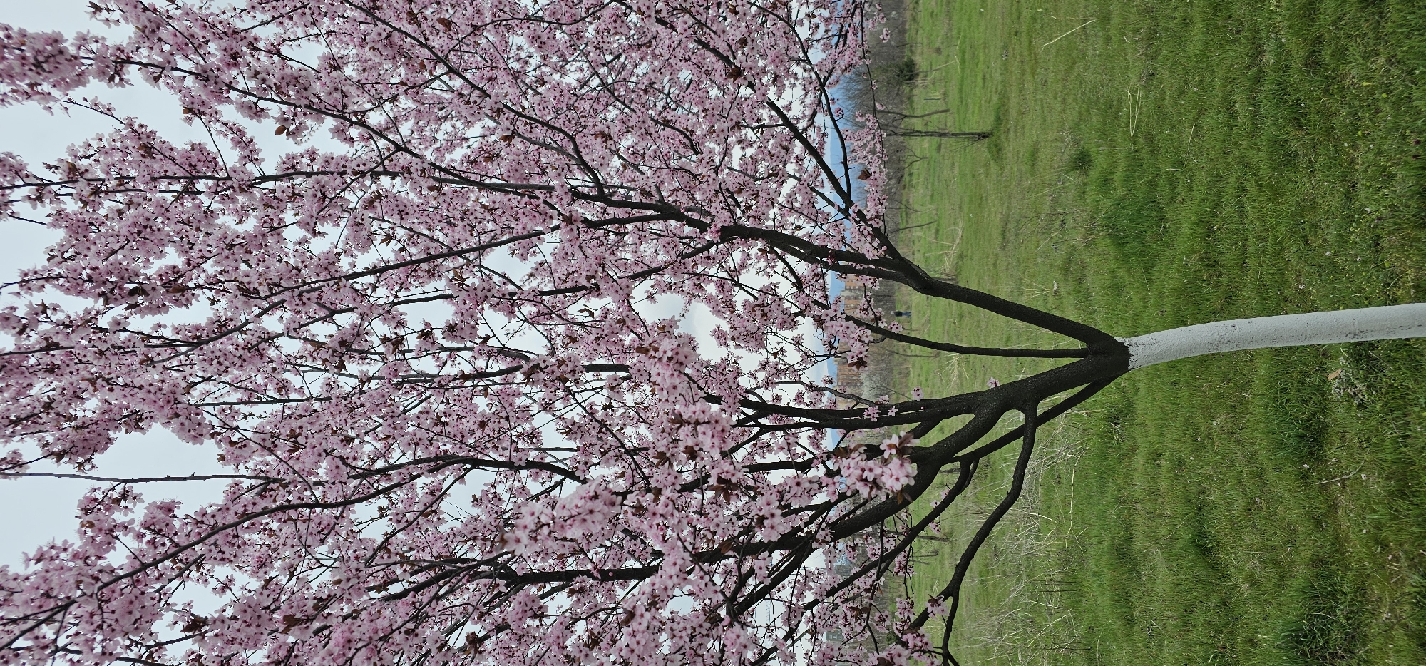 The image captures a flowering tree in full bloom, its branches laden with pink blossoms. The trunk of the tree is partially painted white. The tree is situated in a grassy area, possibly a park or open space. In the background, hints of other trees and possibly buildings are visible, suggesting an urban environment. Based on the prompt, the location is Пловдив, Bulgaria. No people are prominently visible. The sky appears overcast or lightly clouded.